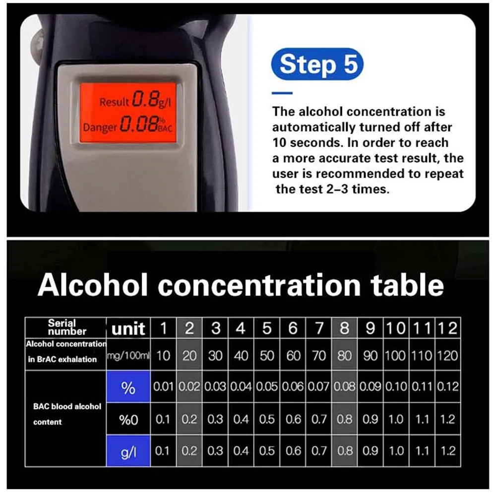 Un éthylotest (contraction de « breath » et « analyzer ») est un appareil permettant d'estimer le taux d'alcoolémie à partir d'un échantillon d'haleine. C'est l'un des éthylotests les plus abordables du marché. Il peut être utilisé dans de nombreux contextes, notamment pour des tests cliniques et pour un usage personnel. Il utilise une technologie de détection d'alcool à semi-conducteurs avancée pour prélever rapidement un échantillon d'haleine et fournir une estimation du taux d'alcoolémie. L'écran LCD graphique indique votre taux d'alcoolémie : dangereux (supérieur à 0,05 %), à risque (environ 0,02 %) ou acceptable (inférieur à 0,02 %). Il affiche « Attention » lorsque le taux est compris entre 0,02 % et 0,05 %, et « Danger » lorsqu'il est égal ou supérieur à 0,05 %.